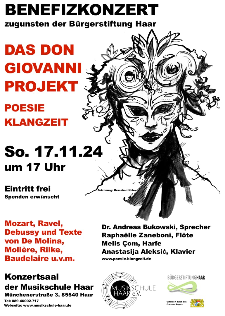 Am Sonntag, den 17. November 2024, um 17:00 Uhr wird der Konzertsaal der Musikschule Haar Schauplatz eines besonderen kulturellen Erlebnisses: das Don Giovanni Projekt des Ensemble Poesie-Klangzeit. Diese Veranstaltung verbindet Poesie und Musik auf einzigartige Weise und lädt das Publikum dazu ein, dem Wesen der legendären Figur des Don Juan nachzuspüren. In einem atmosphärisch dichten Programm wird die Figur in all ihren Facetten beleuchtet – als verführerischer Freigeist, tragischer Held und ewiger Rebell.